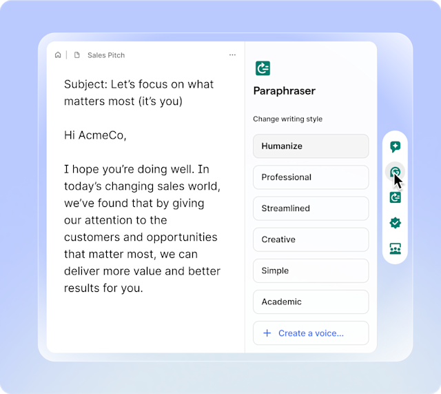 Grammarly’s writing surface is backed by AI agents supporting you at every step of your process. Build on your ideas, draw insights inspired by experts in your industry, and even fine-tune your tone to make every sentence count.