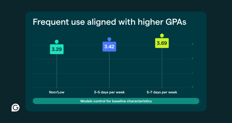 Frequent users achieved an average GPA of 3.69, about 0.4 points higher than non- or low-frequency users (3.29). Models in the Florida Atlantic University analysis controlled for baseline GPA and demographics, reinforcing that the trend aligns with habitual engagement.