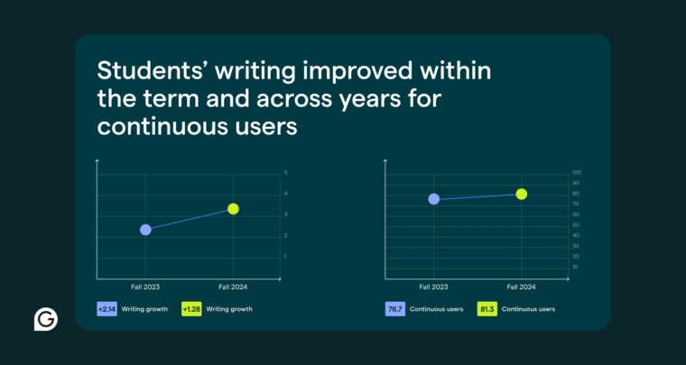 Writing performance scores rose +2.14 points in Fall 2023 and +1.28 in Fall 2024, with continuous users improving from 76.7 to 81.3 year over year. These trends suggest ongoing skill development rather than short-term correction.