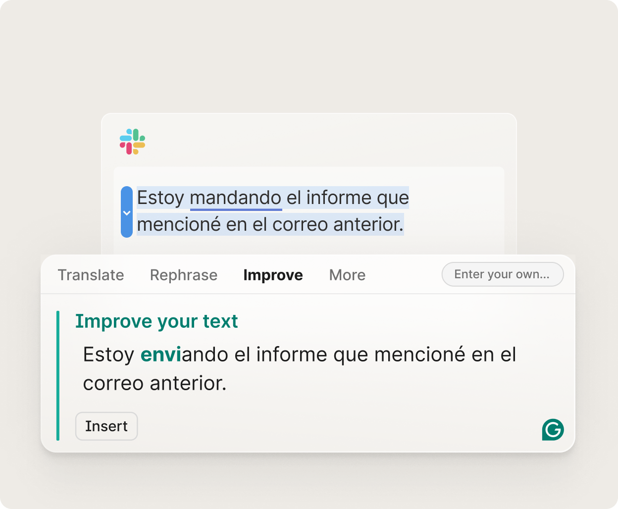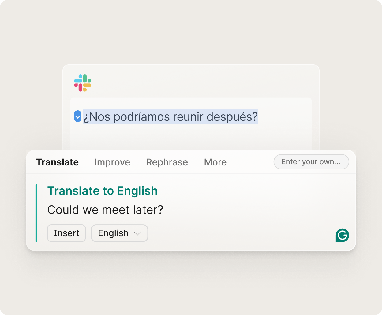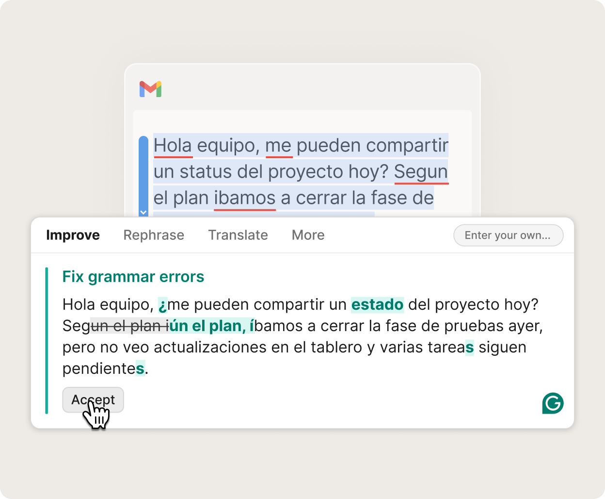 Funciona con el conjunto de herramientas de escritura de Grammarly, desde la corrección de textos hasta la traducción, para que tu escritura sea clara, original y creíble.